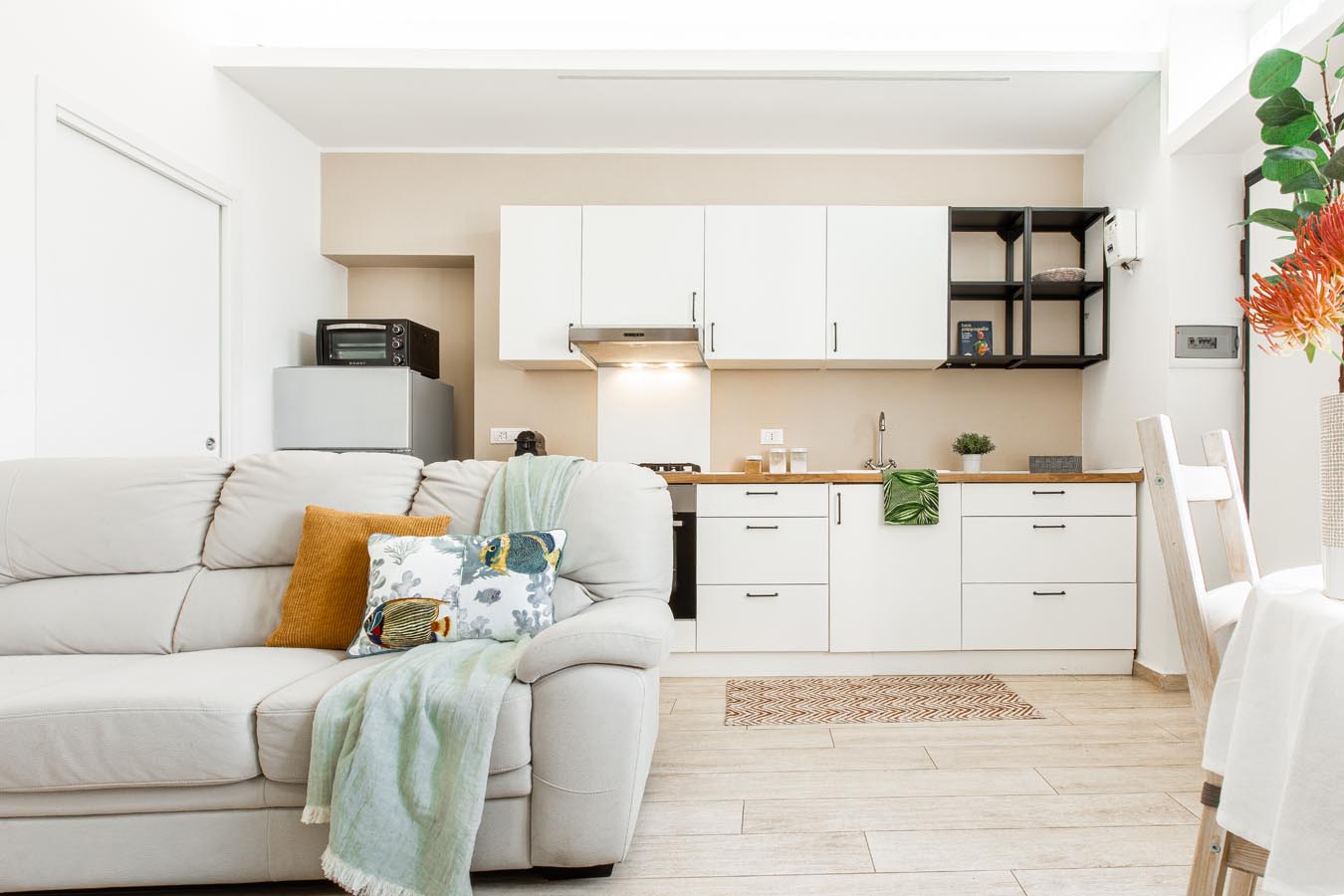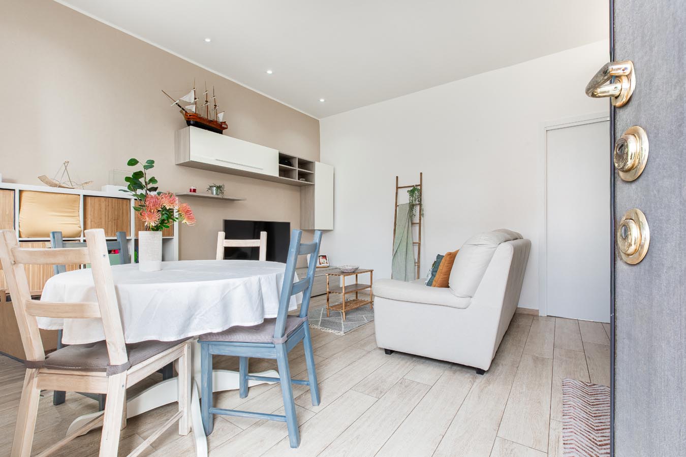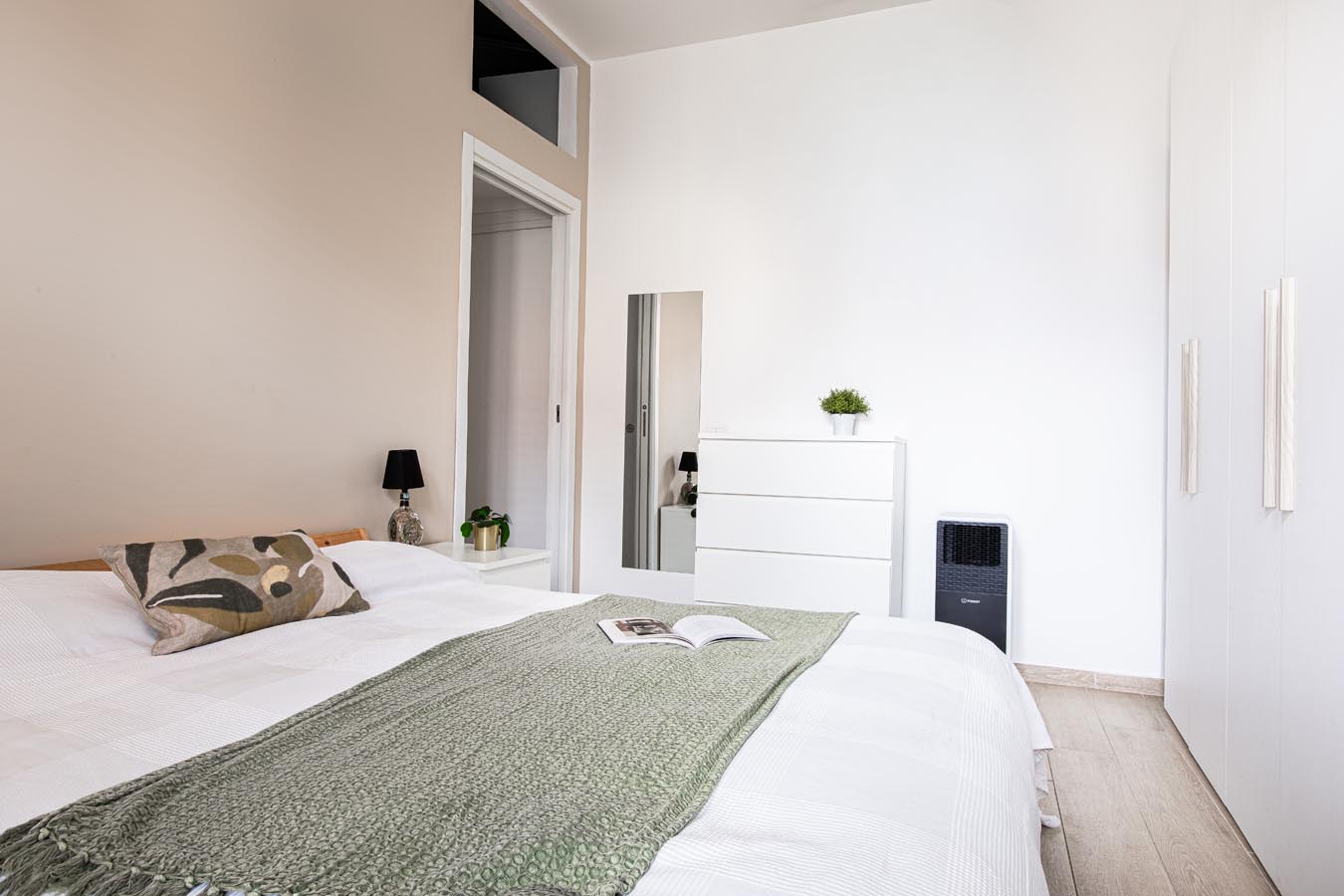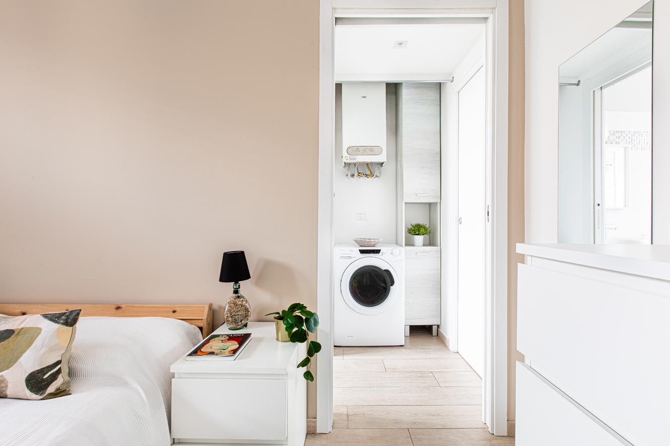 Composto da ingresso diretto sulla zona giorno con la cucina a vista, disimpegno notte con zona ripostiglio e zona lavanderia, camera matrimoniale e servizio finestrato con doccia.