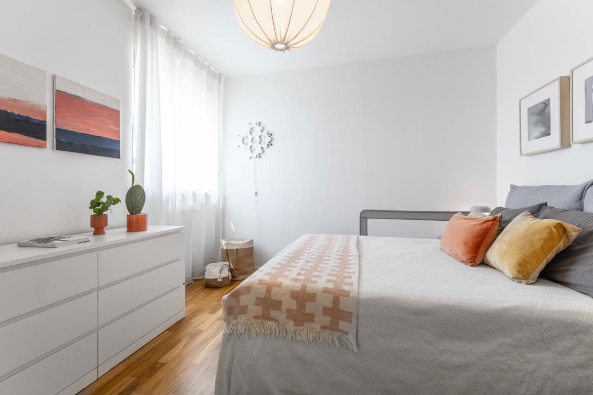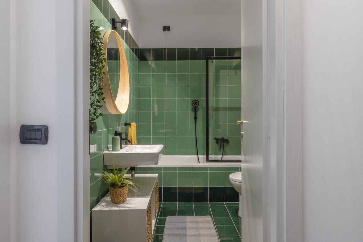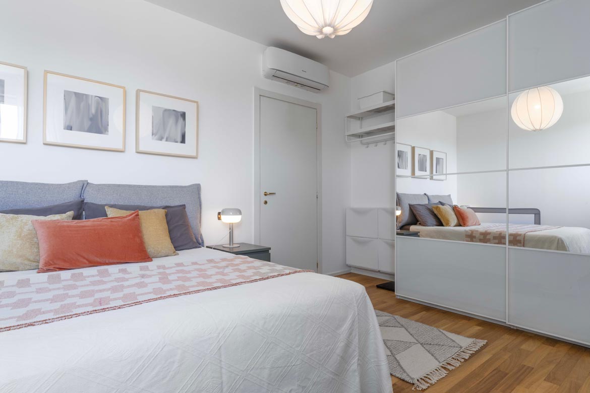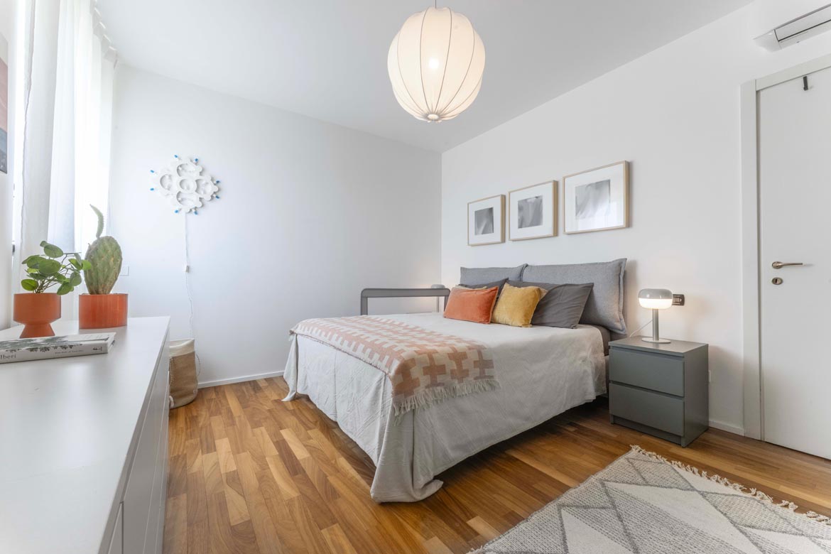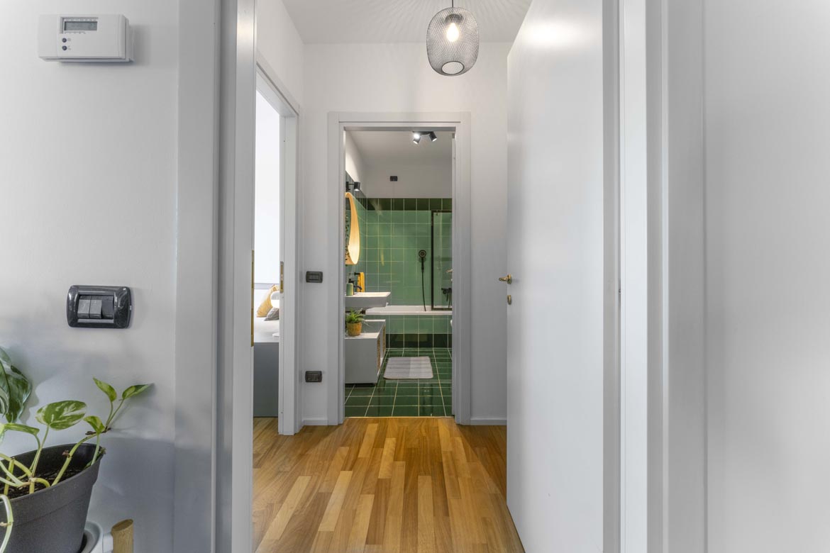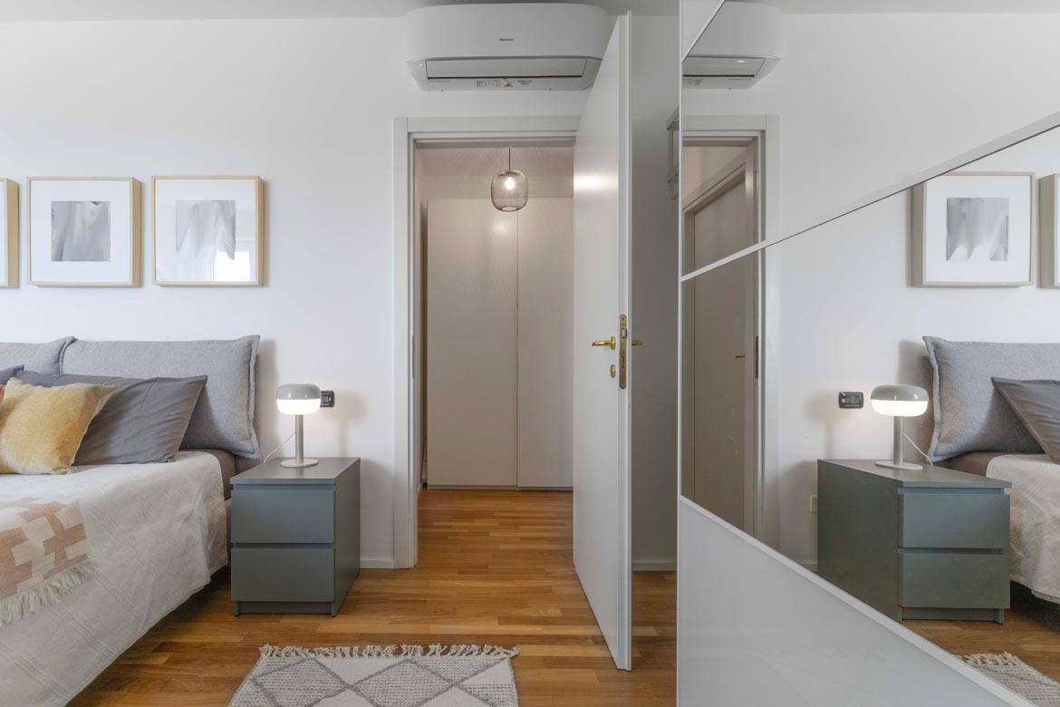 Attraverso un disimpegno riservato si accede alla zona notte: una camera matrimoniale ampia, silenziosa, capace di farti dimenticare la città appena chiudi la porta. Il bagno, comodo e ben rifinito, è dotato di areazione forzata, perfetto anche per l’uso quotidiano di una coppia dinamica.