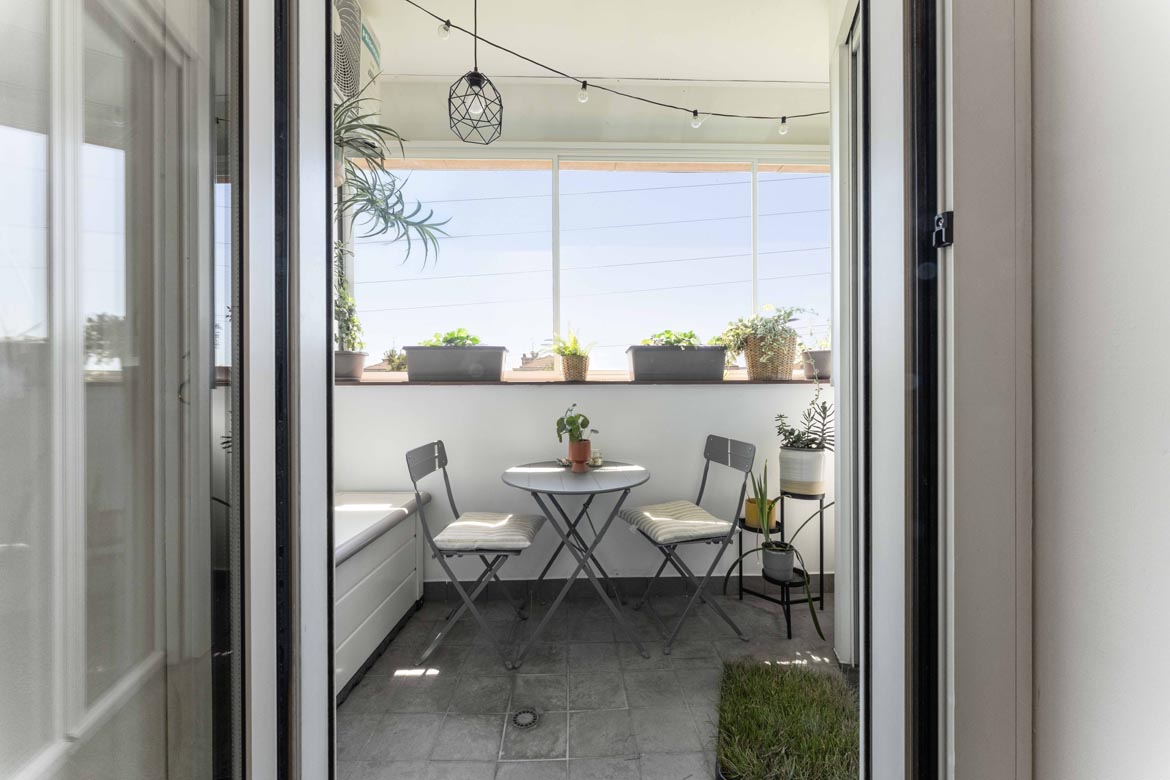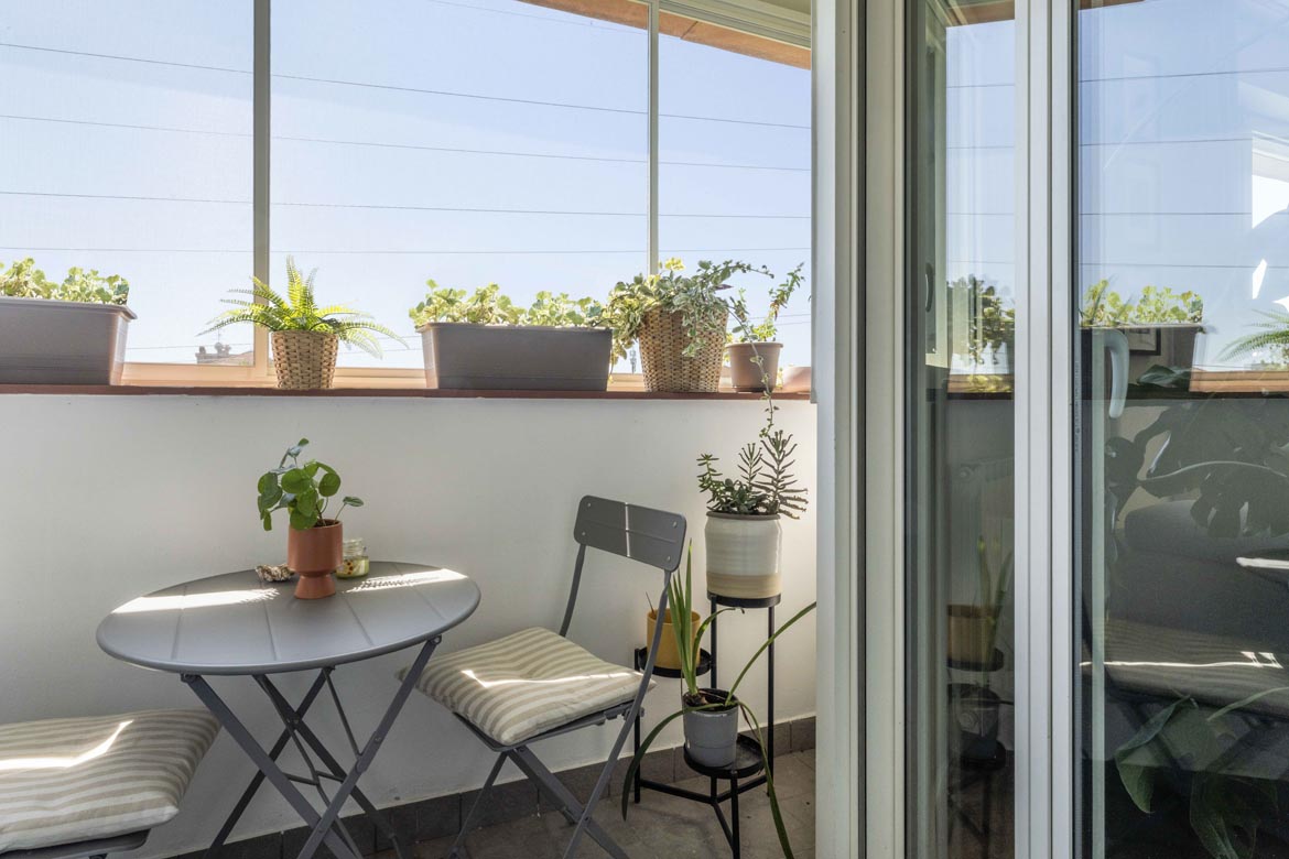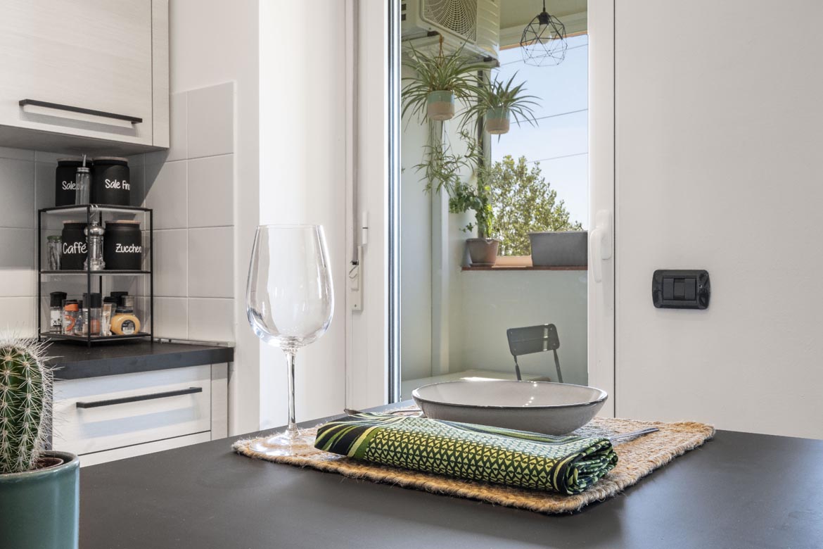 La zona giorno è aperta e luminosa, con una cucina a vista perfettamente integrata e un balcone che prolunga lo sguardo e il respiro.