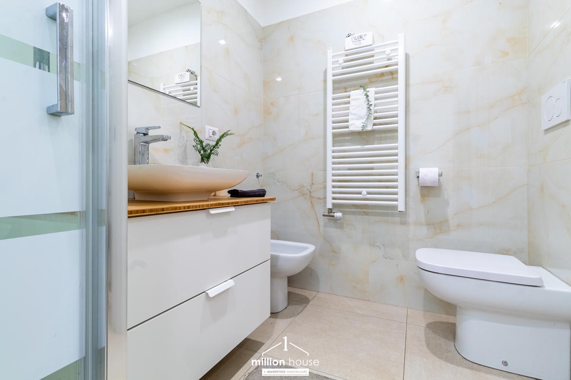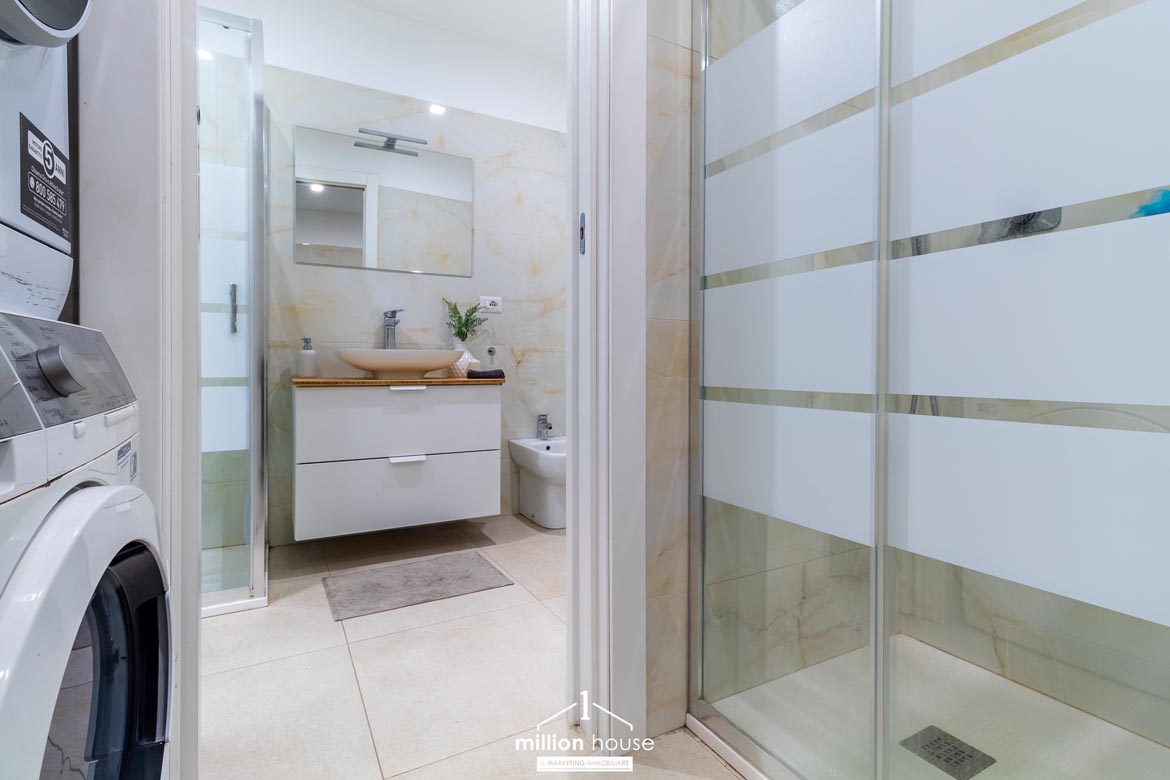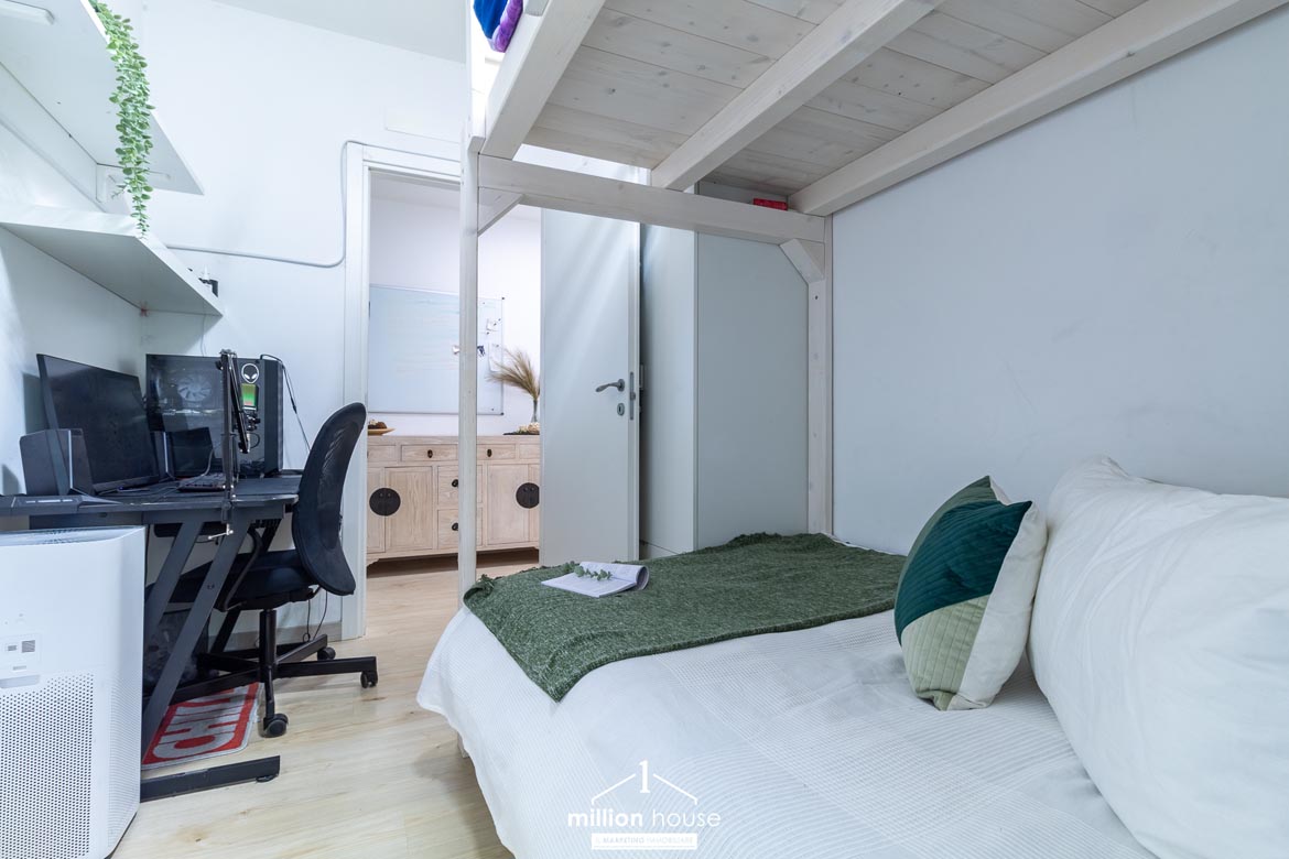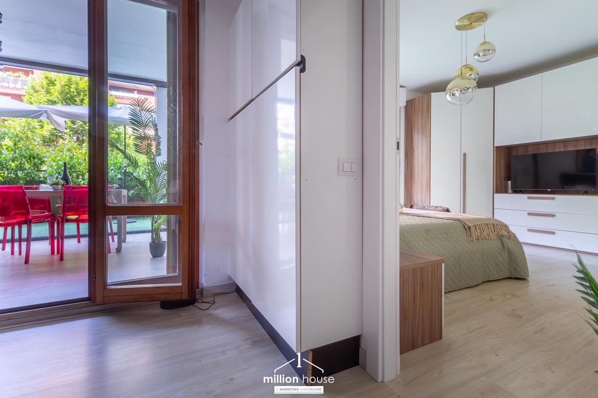 Un salotto con il cielo sopra: vivere dentro e fuori. La zona giorno è il cuore pulsante di questo appartamento: un grande soggiorno con cucina a vista, perfettamente integrata e scenografica, che si apre su un porticato coperto e su un enorme terrazzo che complessivamente contano circa 90mq di superficie. Uno spazio che sembra fatto apposta per le cene d’estate, per i pomeriggi con gli amici, per i silenzi della sera. Un salotto all’aperto, da vivere come una stanza in più.